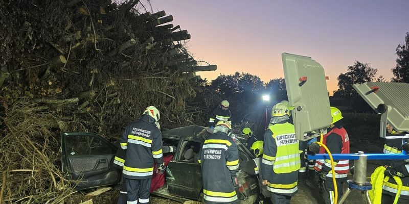 Die zwei Personen im Unfallfahrzeug, der Fahrer und der Beifahrer sollten gleichzeitig mit zwei hydraulischen Rettungsgeräten aus dem Fahrzeug gerettet werden.