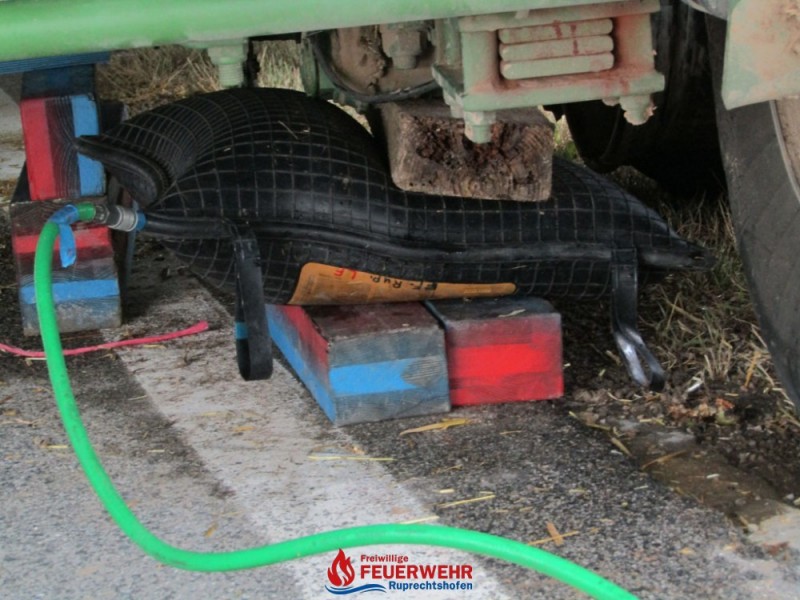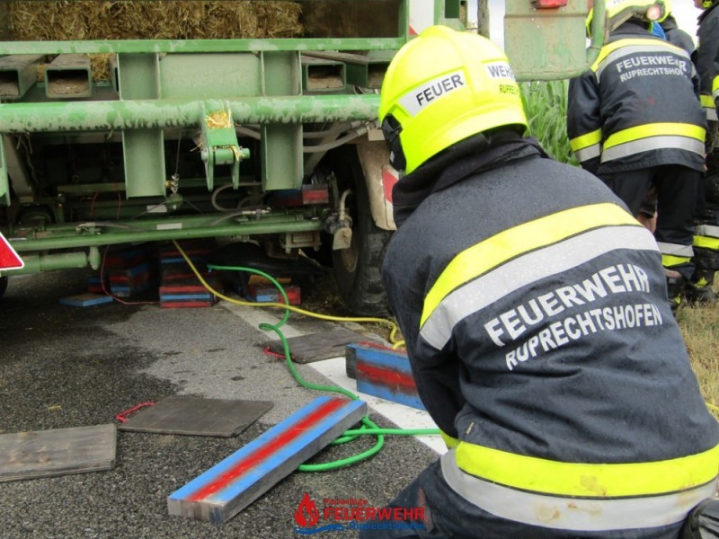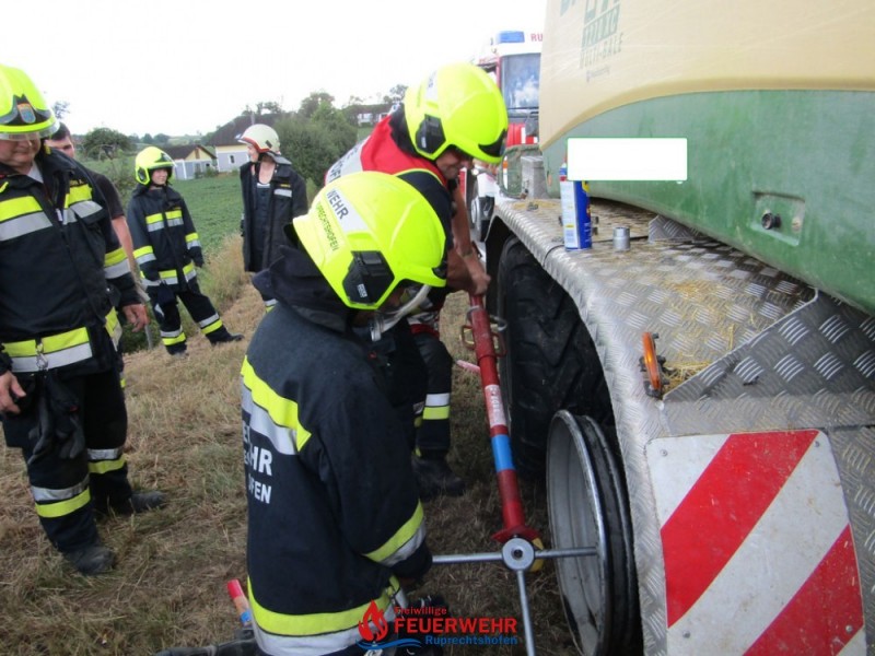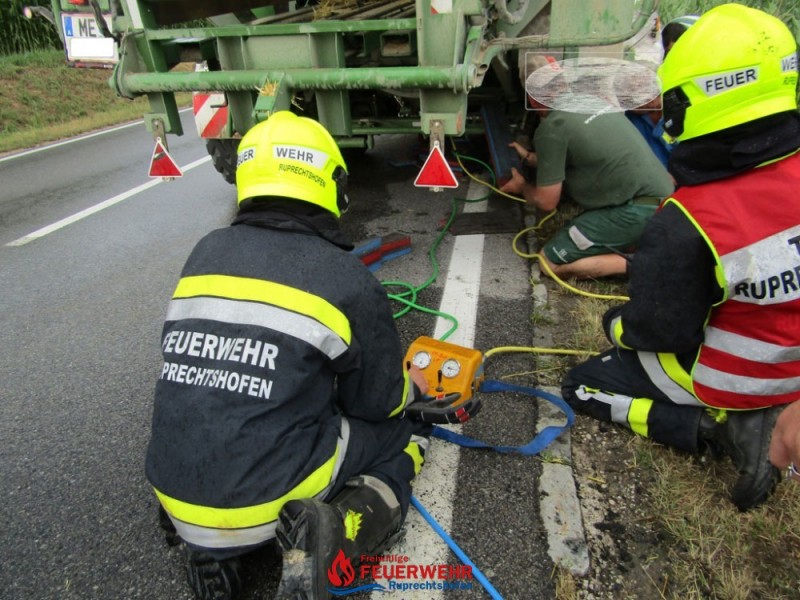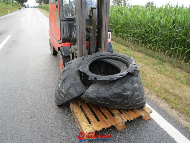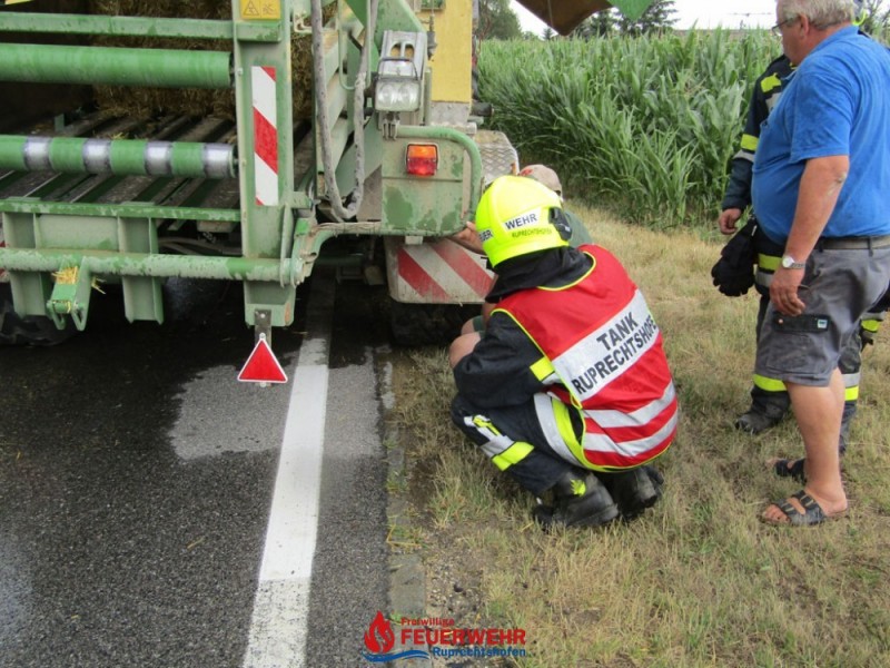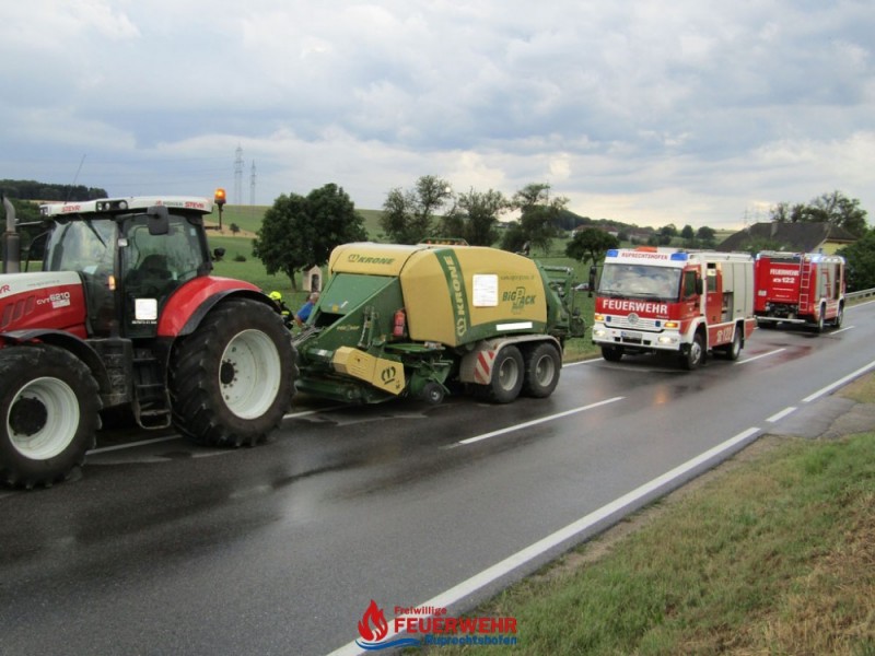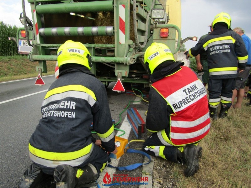 An der Einsatzstelle angelangt, stellte der Einsatzleiter fest, dass es sich bei der knapp 9 Tonnen schweren Strohpresse um einen Reifenschaden handelt und Gefahr besteht, dass durch die überhitzte Felge am Fahrzeug ein Brand entsteht.