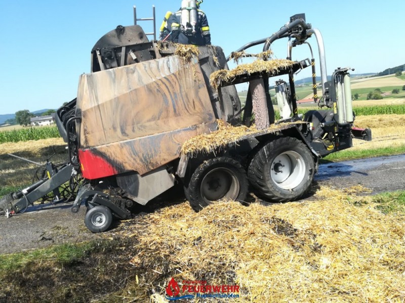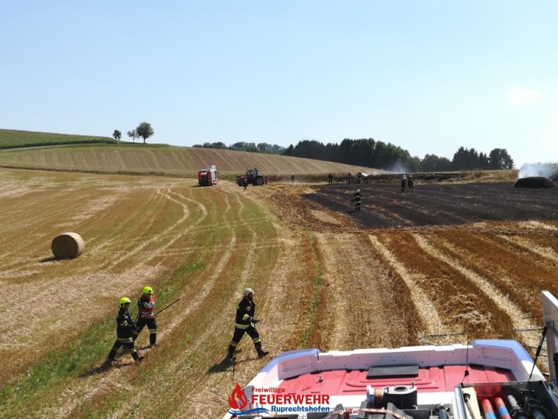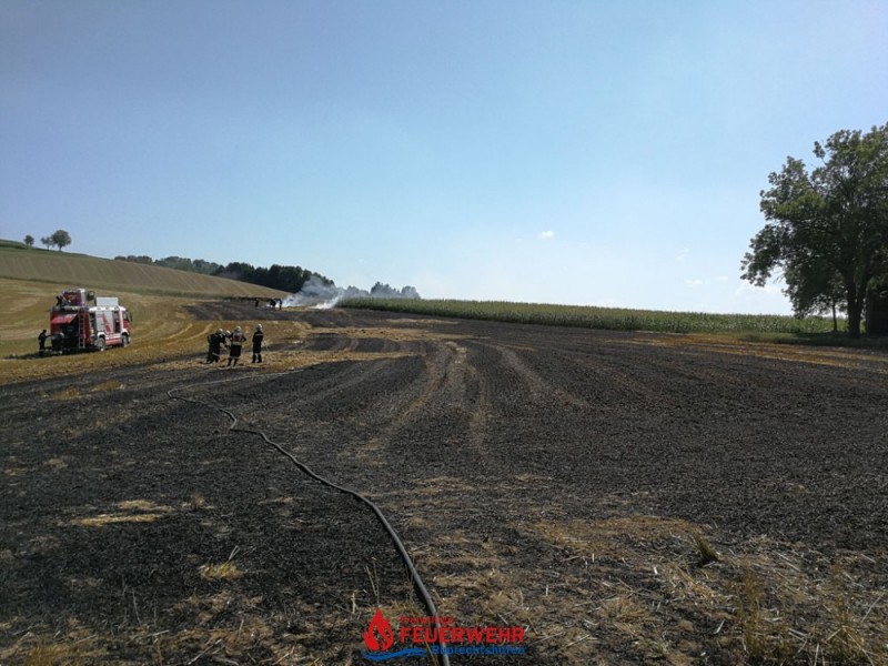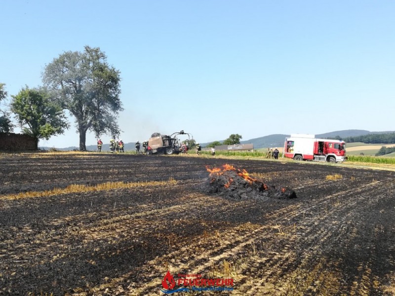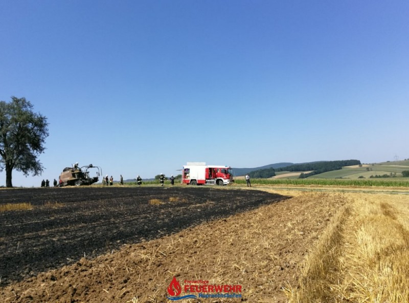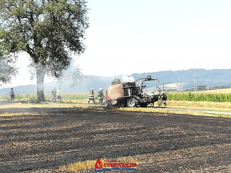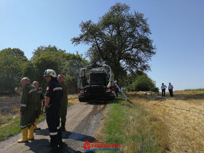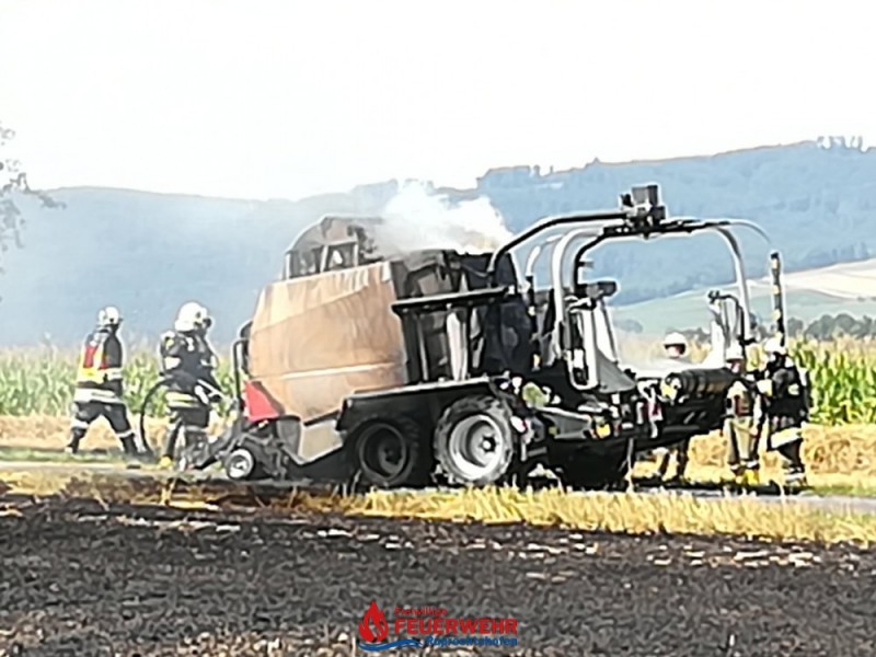 Eine Kombirundballenpresse stand in Vollbrand und ein Flurbrand breitete sich rasch auf der abgeernteten Ackerfläche auf ca. 1 Hektar aus. Auch einige Rundballen haben Feuer gefangen.