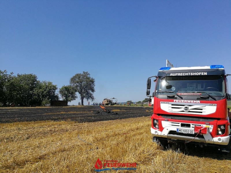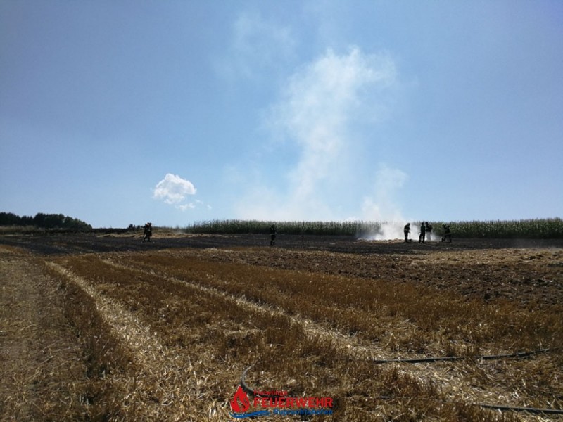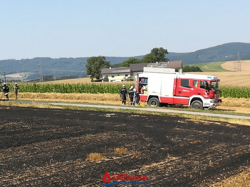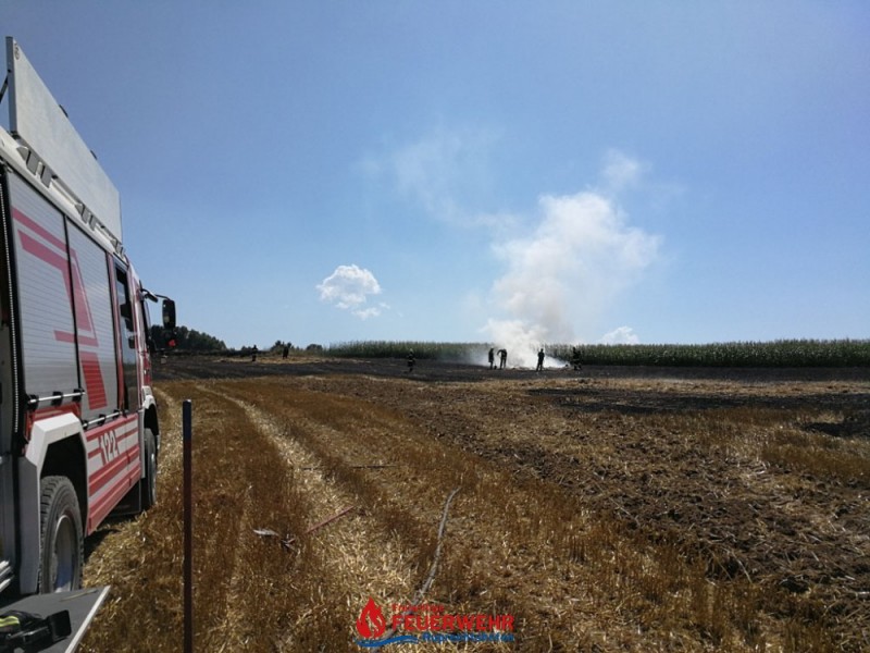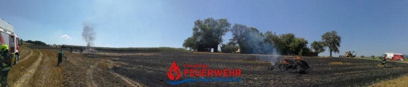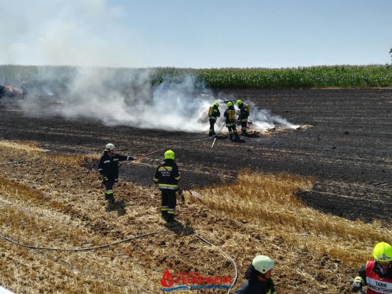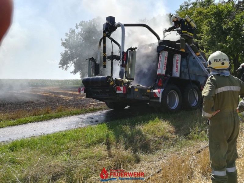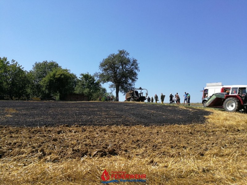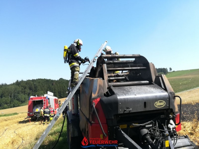 Eine Kombirundballenpresse stand in Vollbrand und ein Flurbrand breitete sich rasch auf der abgeernteten Ackerfläche auf ca. 1 Hektar aus. Auch einige Rundballen haben Feuer gefangen.
