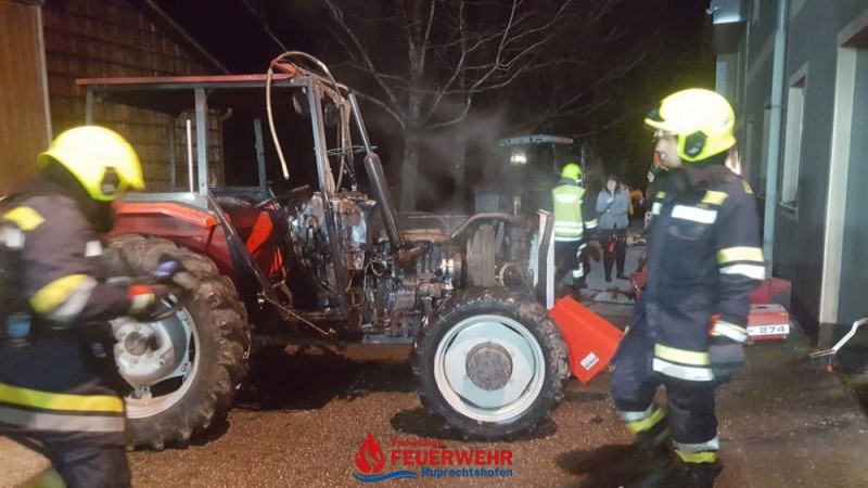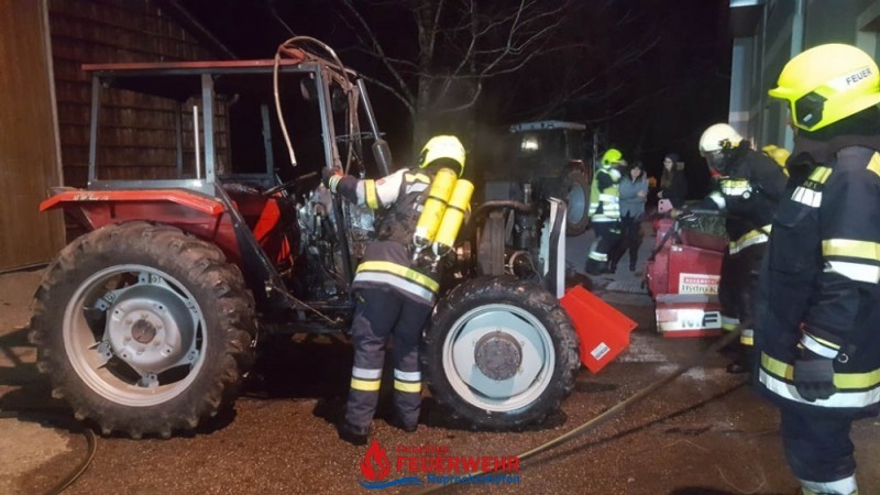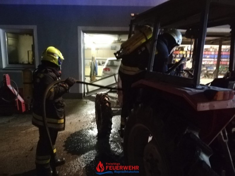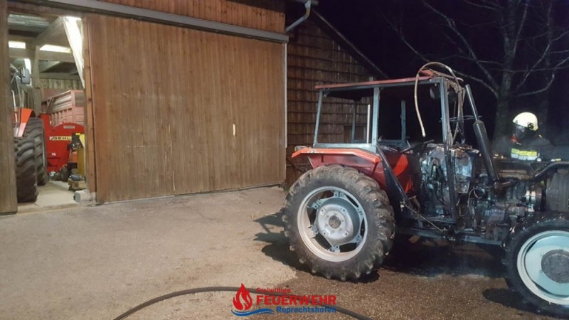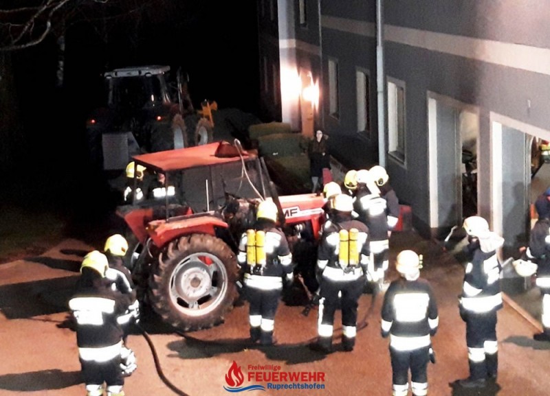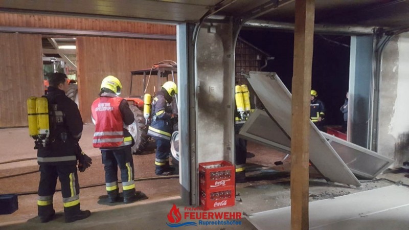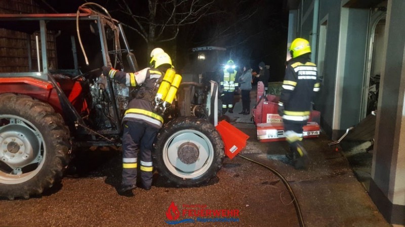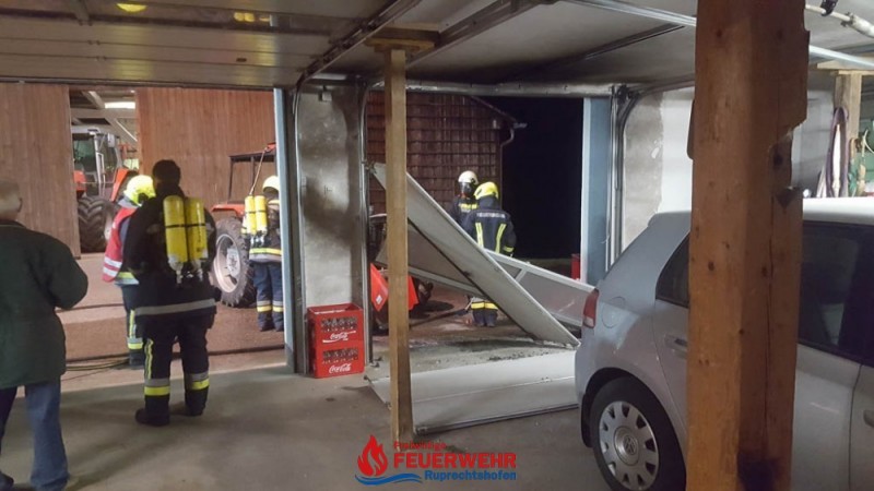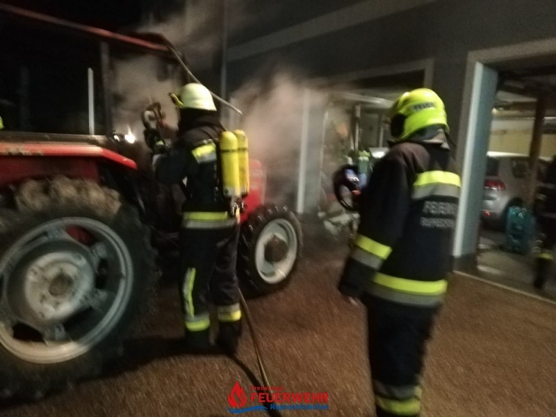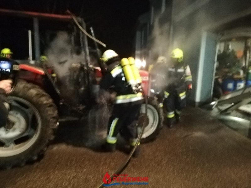Durch einen technischen Defekt startete ein Traktor selbstständig in einer Maschinenhalle. Das Fahrzeug durchbrach führerlos das Holzschiebetor und krachte auf der gegenüberliegenden Seite durch ein Sektionaltor in eine Garage. Ein PKW wurde dadurch beschädigt. Der Traktor stand in Brand und es drohte eine Brandausbreitung in der Garage, die an das Wohnhaus von Familie S. angrenzt.