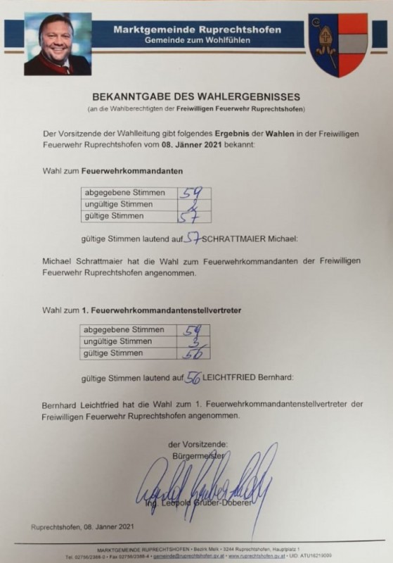 Die Wahl selbst konnte unter dem Vorsitz von Bürgermeister Ing. Leopold Gruber-Doberer und der geltenden Pandemievorgaben, termingerecht am 08. Jänner 2021 durchgeführt werden.