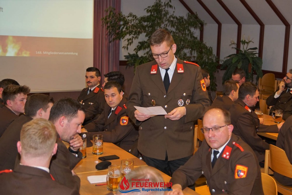 Entsprechend der Tagesordnung begrüßte Kommandant HBI Michael Schrattmaier mit persönlichen Worten die Ehrengäste, Herrn Bürgermeister Ing. Leopold Gruber-Doberer, Vizebürgermeister Johannes Scherndl, Abschnittsfeuerwehrkommandant BR Manfred Babinger, sowie die anwesenden Feuerwehrmitglieder und Feuerwehrjugend zur 148. Mitgliederversammlung.