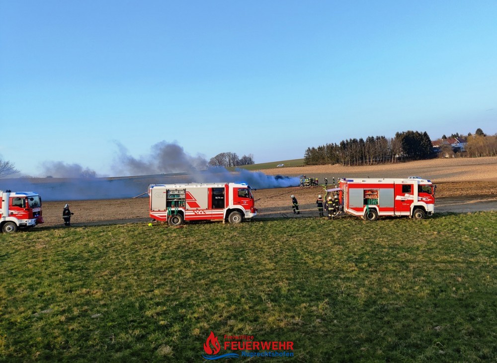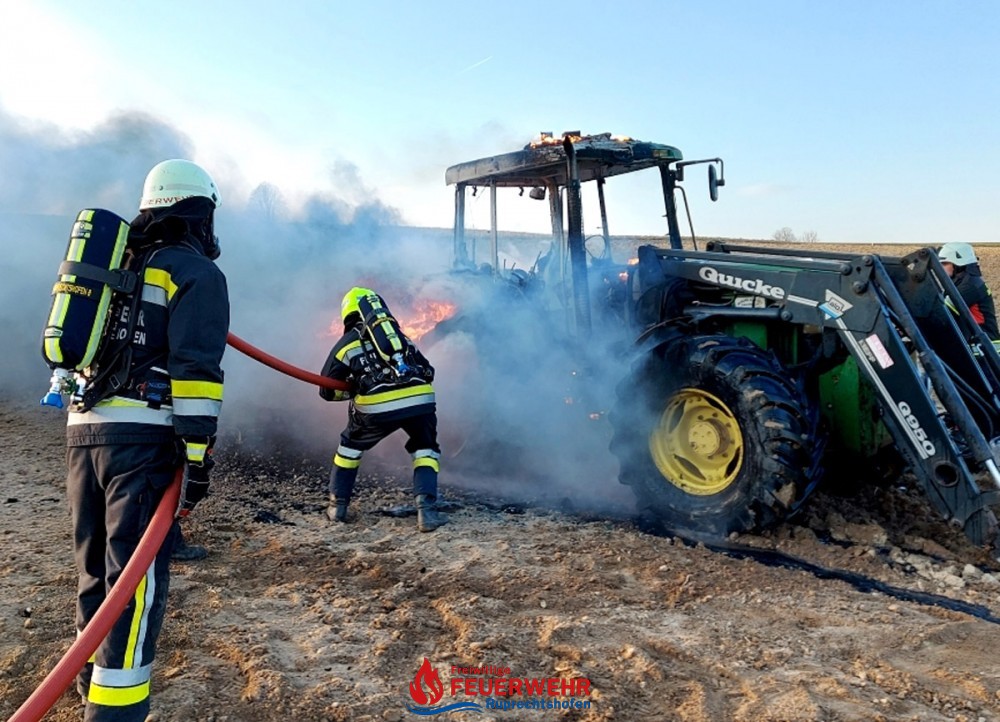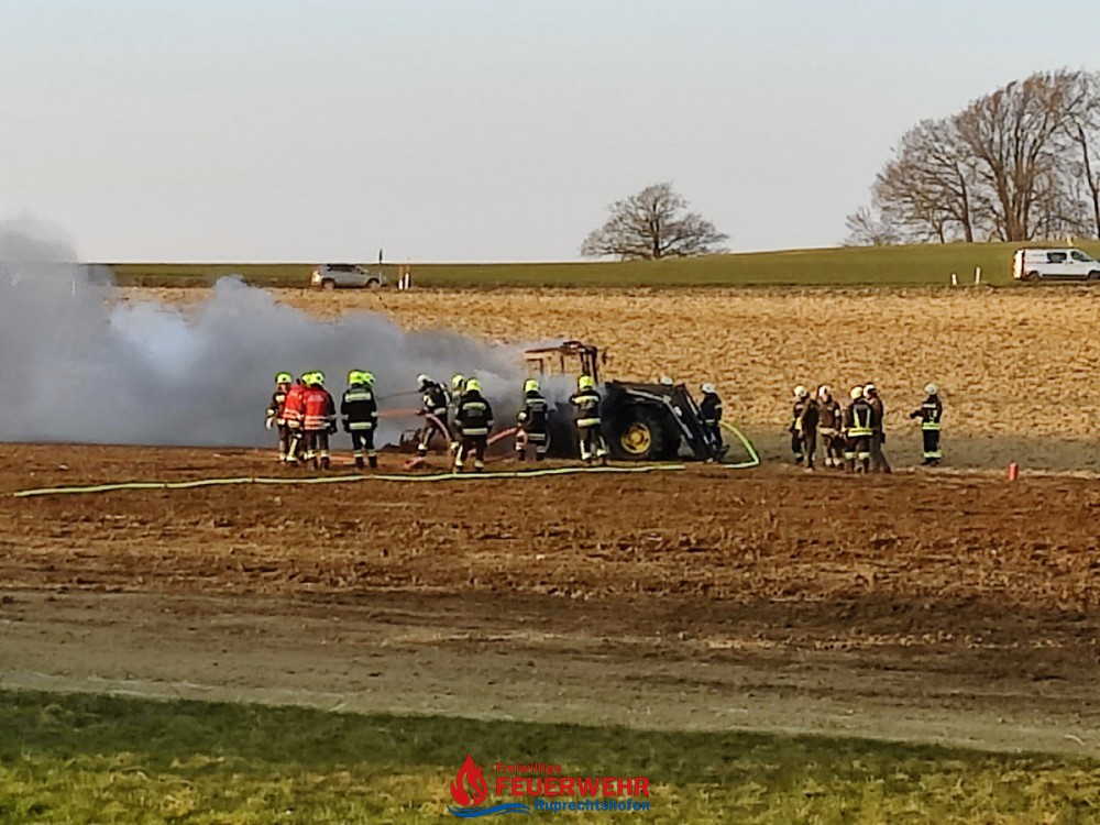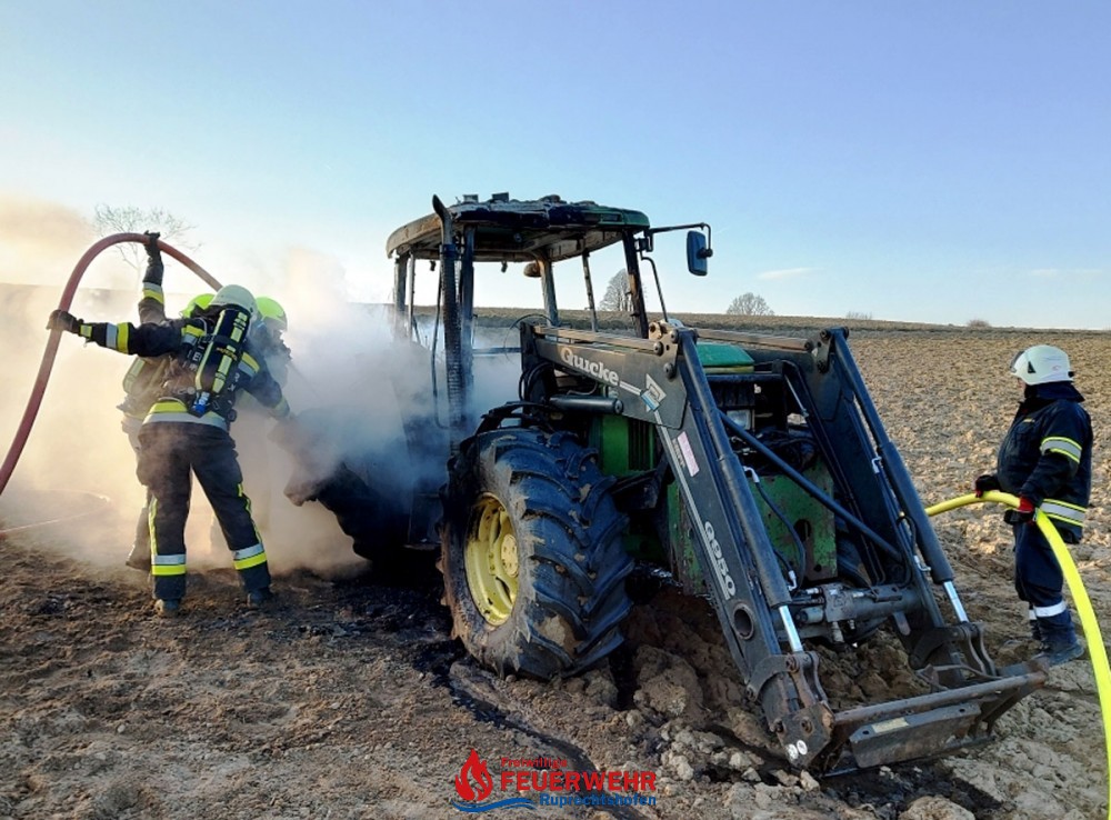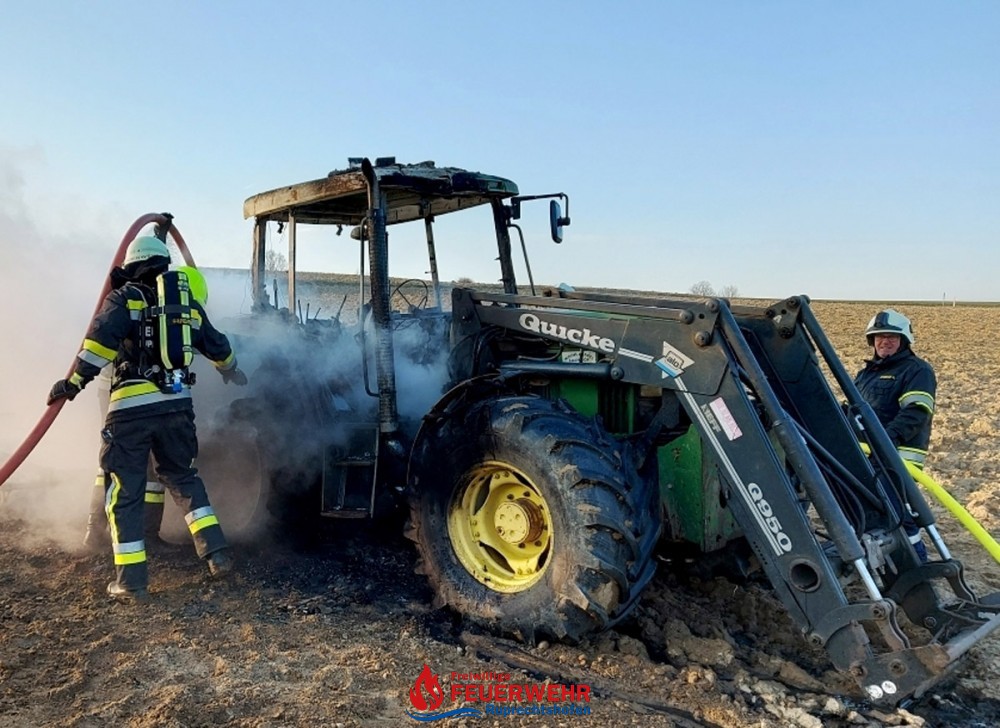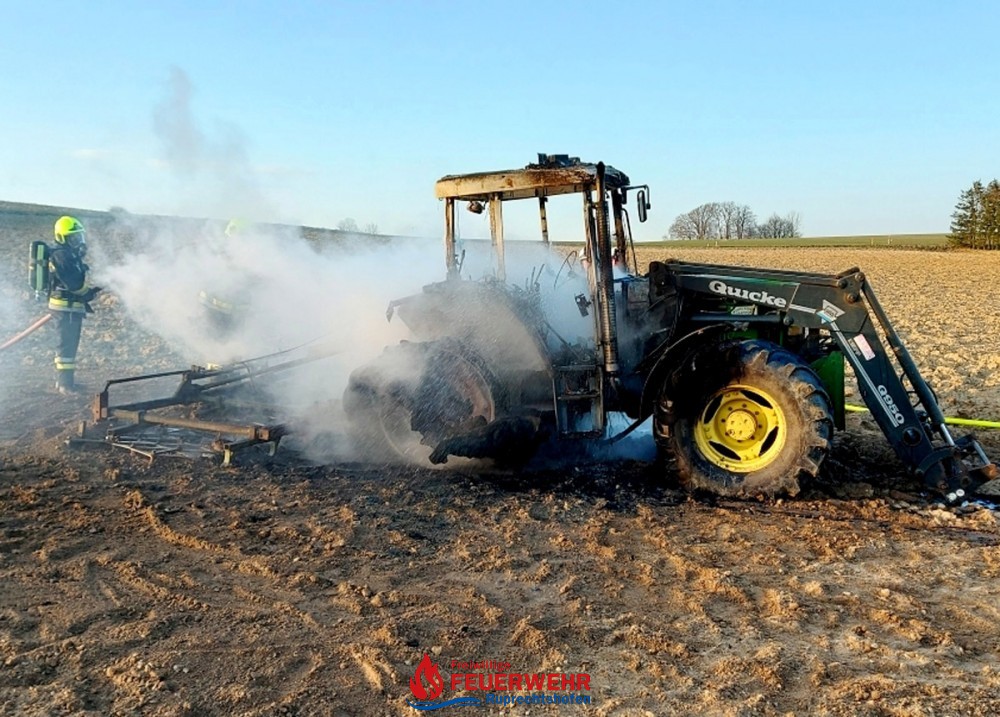 Zur Unterstützung der FF-Brunnwiesen rückten wir mit RLF2000, Pumpe und KDO mit ALA zum Einsatzort nach Brunnwiesen aus. Ein Traktor war aus ungeklärter Ursache mitten auf einem Feld in Brand geraten.