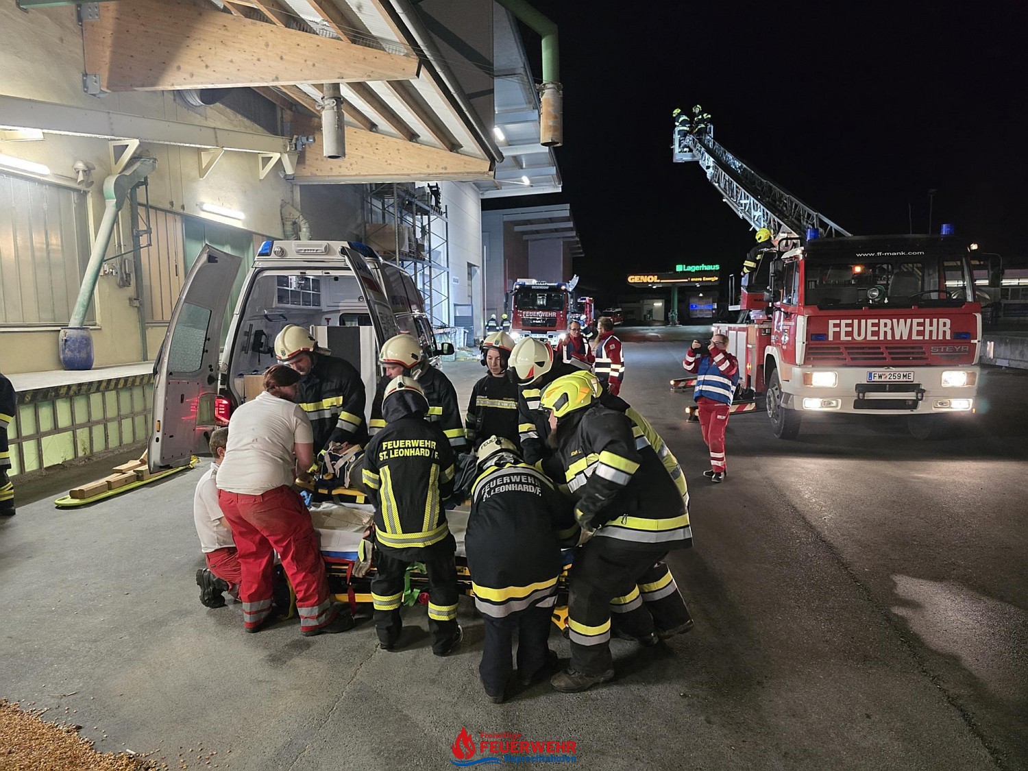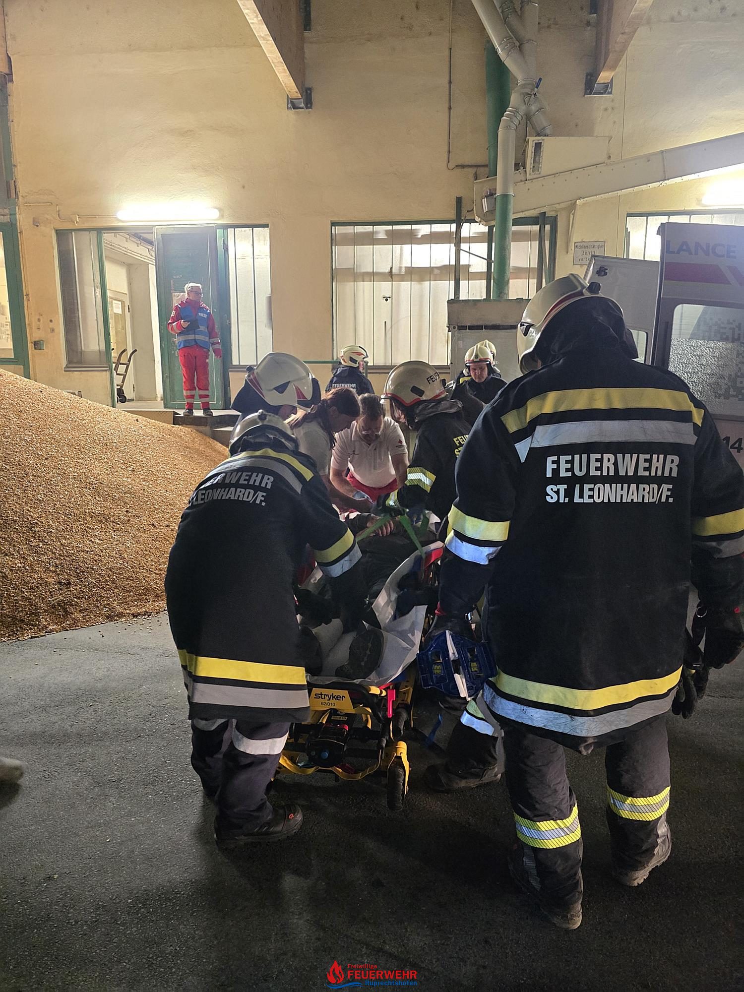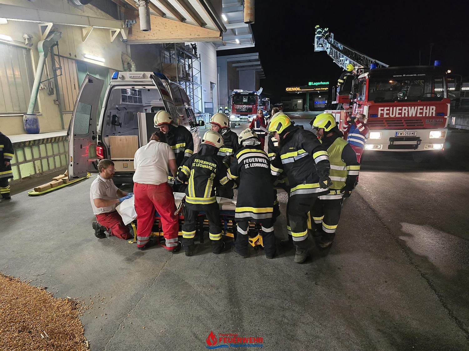 • Eine Personenrettung aus dem Keller des Getreidesilos, bei dem die Personenrettung durch ein sehr enges Stiegenhaus erschwert wurde.